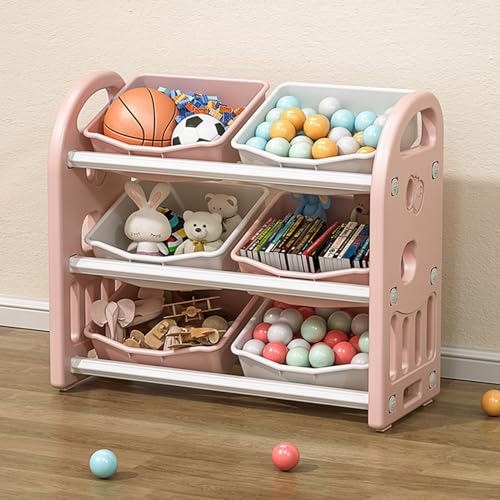 Kids Toy Storage Organizer with 6 Removable Bins Multi-Purpose 3-Tier Shelf Storage Cabinet Unit for Bedroom Playroom Living Room Pink
