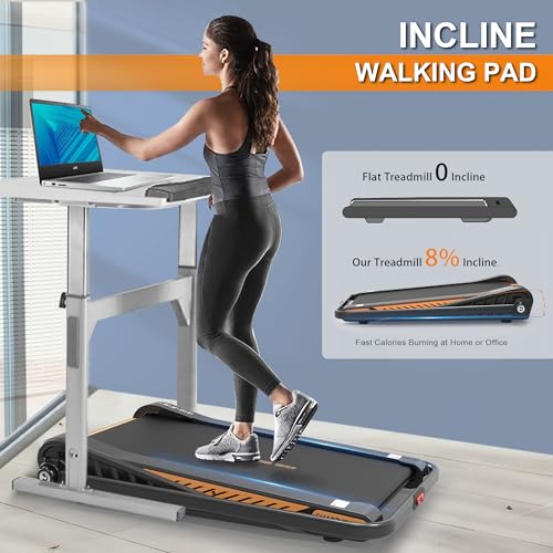 【2.5HP Powerful & Quiet Motor】This walking treadmill with a powerful 2.5HP quiet motor, allowing to load big weight capacity up to 280 lb. With the fixed 8 degree inclination of running deck, the mini walking pad delivers natural, smooth and consistent working, as well as keeps people away from noise of workouts at home or office.