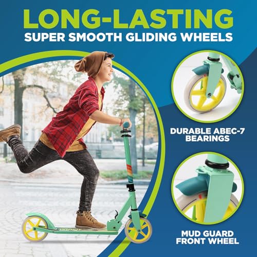 SMOOTH RIDING WHEELS: The 2-wheel scooter features long-lasting, smooth 7” gliding wheels w/ durable ABEC-7 bearings that run smoothly even on surfaces that are uneven or bumpy. Equipped w/ mudguard front wheel and non-slip deck + foot stand