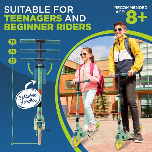 FOLDING DESIGN: This scooter for teens features a space-saving folding design great for traveling. Additional safety features include foldable handles & PU rear-wheel foot brake that allows the user to easily and smoothly stop the scooter