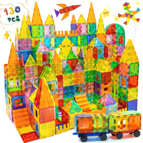 EchoPlan 130 PCS Magnetic Tiles,Magnetic Building Blocks with 2 Cars,Magnet Tiles 3D Clear Construction STEM Preschool Sensory Educational Toys Set for Kids Toddlers Boys 3 4 5 6 7 8 9+ Year Old