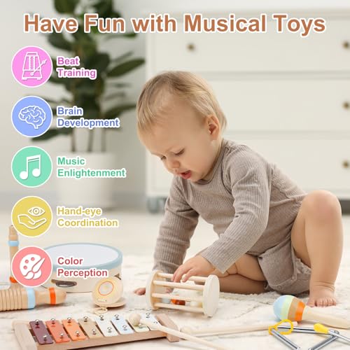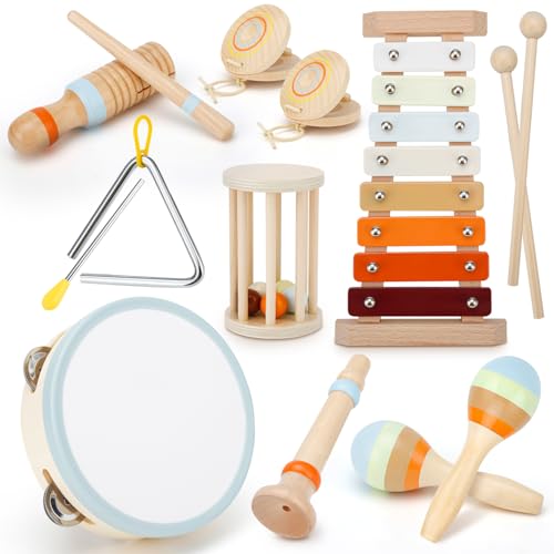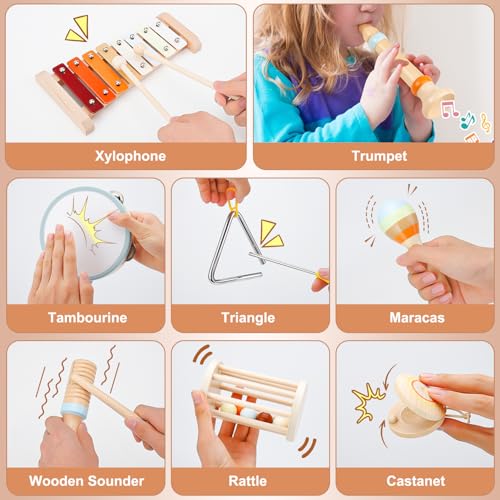 Toddler Musical Instruments, Musical Toys for Toddlers 3+, Montessori Wooden Percussion Set, Kids Musical Instruments, Orff Instruments with Xylophone Tambourine Maracas for Kids Musical Learning Toys