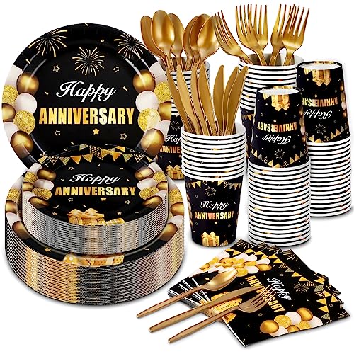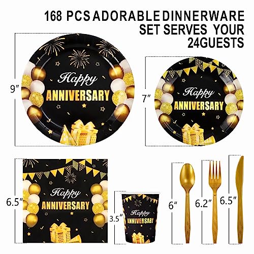 168Pcs Black and Gold Party Supplies Tableware Set Happy Anniversary Plates, Knife,Forks,Spoons, Cups and Napkins Table Decorations for Anniversary Wedding Birthday Party Decorations, 24 Guests