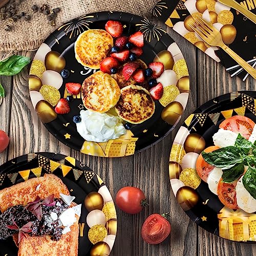 SERVES 24 GUESTS: This Black and Gold Birthday Sets has all you need for 24 guests, includes 24pcs 9” Dinner Paper Plates, 24pcs 7” dessert Plates, 24pcs paper Napkins, 24pcs paper cups ,24pcs forks, 24pcs spoons, 24pcs knives.