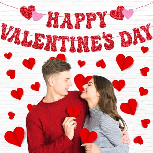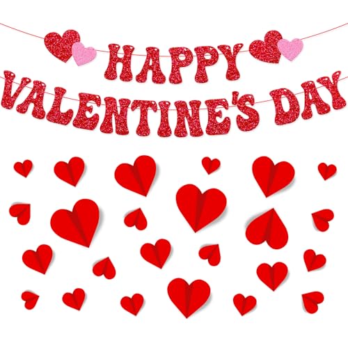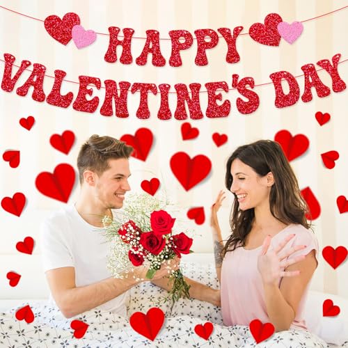 Package Including:1 set happy valentine’s day banner,the first one “HAPPY” words banner with red and pink heart patterns,the second one is “VALENTINE’S DAY” words banner .24 PCS 3D red heart wall decals,including 5 size.This banners romantic design add a festive touch to your Galentine’s Day celebration,these 3D heart wall decals in different sizes will help you create a romantic Valentine’s Day scene,These happy Valentine’s day party decorations will bring back unforgettable memories for you and your lover on Valentine’s Day!