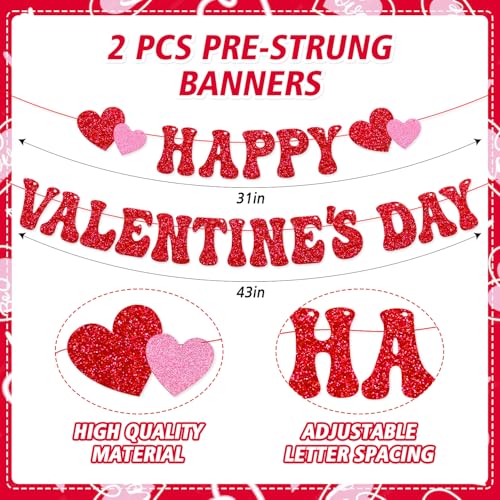 Perfect Size:This happy Valentine’s day banner,the first one banner is approx 31” inches in length,the second one banner is approx 43” inches in length.2 PCS 7.9” inches in length red heart wall decals,4 PCS 6.3 inches” in length red heart wall decals,4 PCS 4.7” inches” in length red heart wall decals,10 PCS 3.5” inches” in length red heart wall decals,4 PCS 2.4 inches” in length red heart wall decals.These wall decals and banners can creates a variety of romantic and delicate shapes, creating a vivid and dreamy Valentine’s Day wall art scene for your room.