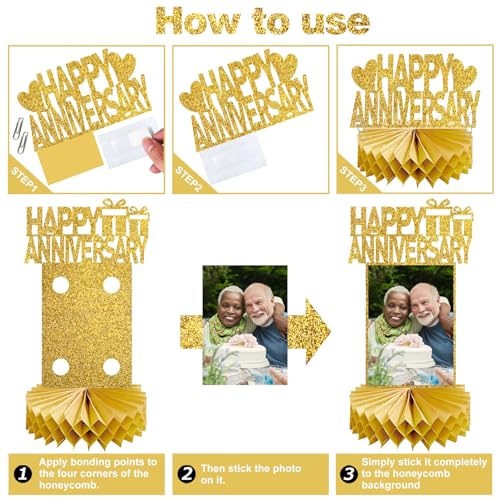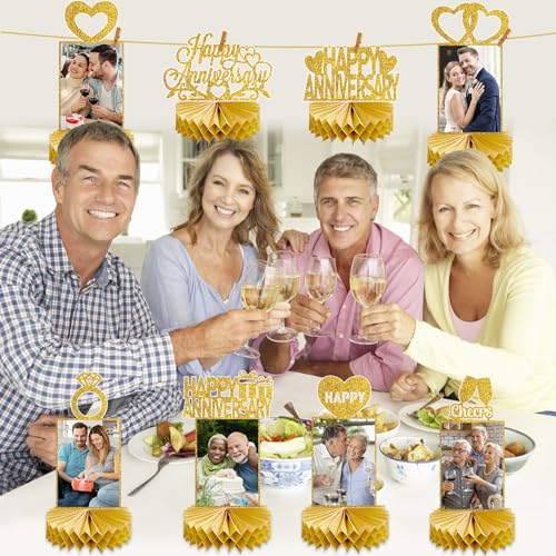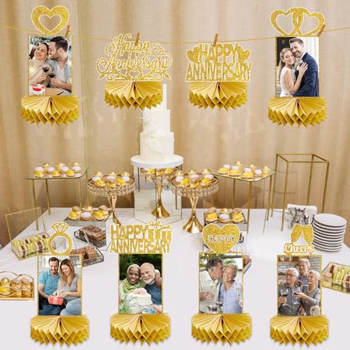 8Pcs Gold Happy Wedding Anniversary Decorations Honeycomb Centerpiece, Gold Glitter Anniversary Photo Table Centerpiece Party Supplies, 25th 30th 40th 50th 60th Gold Anniversary Table Topper