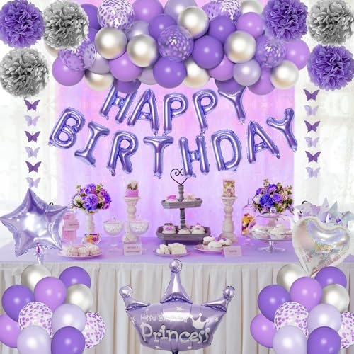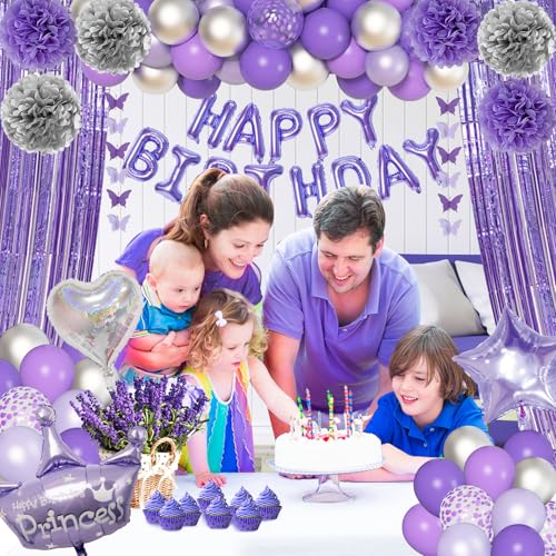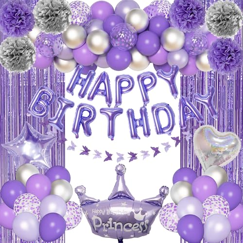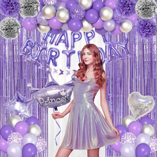 Ouddy Life Purple Birthday Decorations for Women Girls, Lavender Sliver Confetti Happy Birthday Star Heart Crown Balloons Fringe Curtain Butterfly Garland for Engagement Anniversary Party Supplies