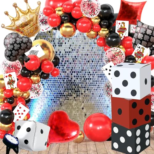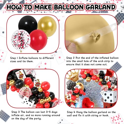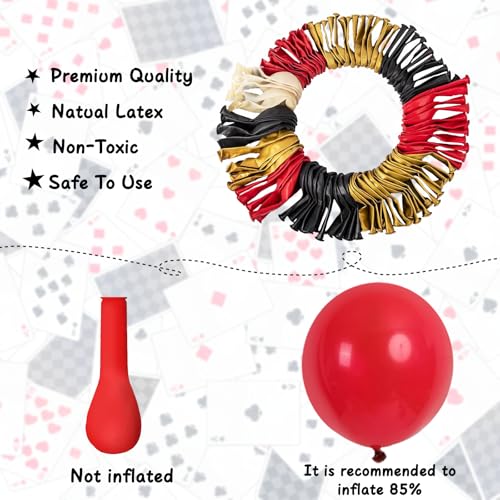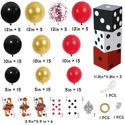 【Content contains】12 inch latex balloons*15(Red, Black, Gold) ,10 inch latex balloons*45(Red, Black, Gold),5 inch latex balloons*45(Red, Black, Gold) , 12 inch Black and red confetti balloons*5, Dice Crown Poker Foil Balloons*6, dice favor boxes*3(Red, Black, Gold), Playing Cards*6, and 3pcs balloon arch accessories