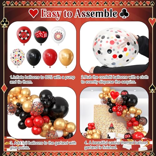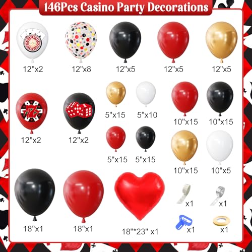 Casino Party Decorations: This casino theme party decorations kit includes 2pcs 18inch casino balloons (red/ black), 8pcs 12inch confetti balloons, 6pcs 12inch casino themed print balloons, 15pcs 12inch balloons (red/ black/ metal gold), 50pcs 10inch balloons (red/ black/ metal gold/ white), 55pcs 5inch balloons (red/ black/ metal gold/ white), 1pc heart foil balloon, 4pcs balloon accessories.