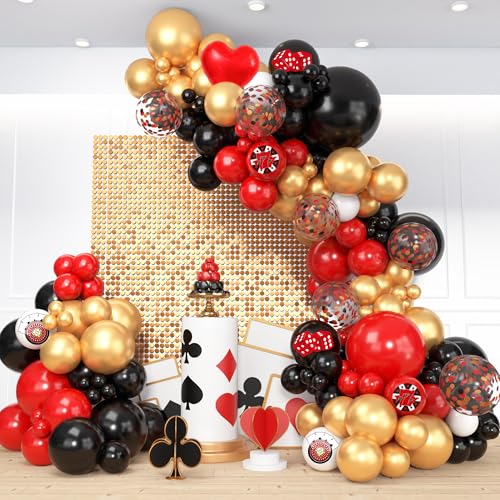 140Pcs Casino Red and Black Balloon Arch Garland Kit, Gold Confetti Balloons for Casino Theme Party Decorations Poker Event Las Vegas Game Night Birthday Party Supplies
