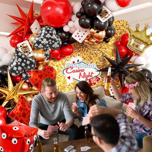 165pcs Casino Balloon Arch Garland Kit, Red Black Gold Balloons with Star Crown Dice Poker Foil Balloons for Birthday Casino Night Las Vegas Casino Theme Party Decorations