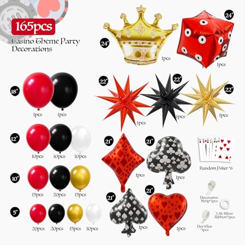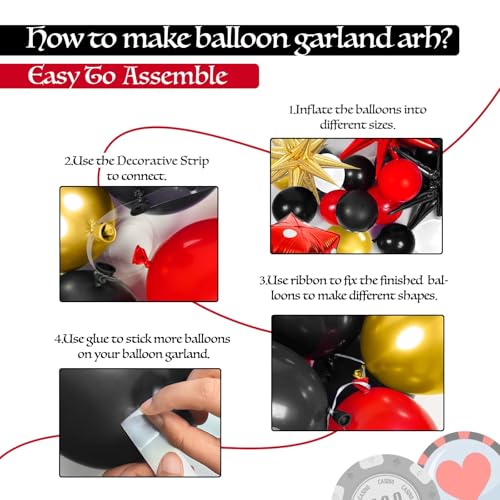 Package Include: The kit include 51pcs black balloons(18inchx1, 12inchx10, 10inchx20, 5inchx20), 36pcs red balloons(18inchx1, 12inchx10, 10inchx15, 5inchx20), 30pcs metallic gold balloons(10inchx15, 5inchx15), 20pcs white balloons(12inchx10, 5inchx10), 5pcs foil Balloons (24inch gold crown foil balloonsx1, 24inch red dice foil balloonsx1, star foil balloonsx3) , 4pcs poker foil balloons (heart, spade, club, diamond), glue dotx100, ribbonsx1, decorative stripx1, random pokerx5