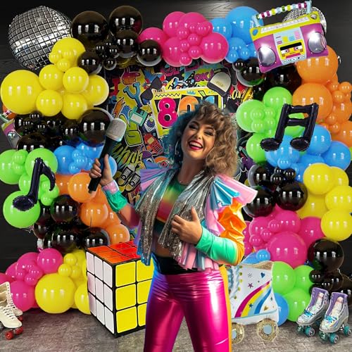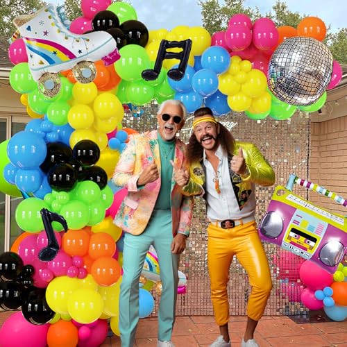 80S 90S themed Balloon Garland Kit : This 128-piece balloon set covers a spectrum of vibrant colors, perfect for crafting memorable ’80s, ’90s, and 2000s themed parties. The assortment includes hot pink, orange, yellow, blue, lime green, and black balloons in various sizes, alongside distinctive foil balloons like a radio, roller skates, musical notes, and a disco ball, providing everything needed for a hip hop,graffiti or rockstar party decorations!
