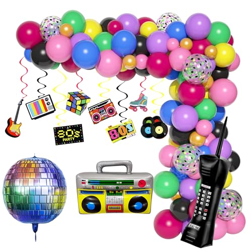 Amandir 80s 90s Party Decorations, 114Pcs Balloon Arch Kit 80’s 90’s Hanging Swirls Inflatable Disco Ball Radio Boom Box Retro Mobile Phone Balloons for Back to 80s 90s Hip Hop Birthday Supplies