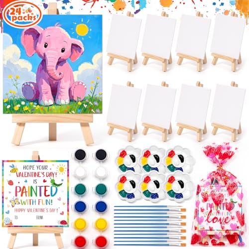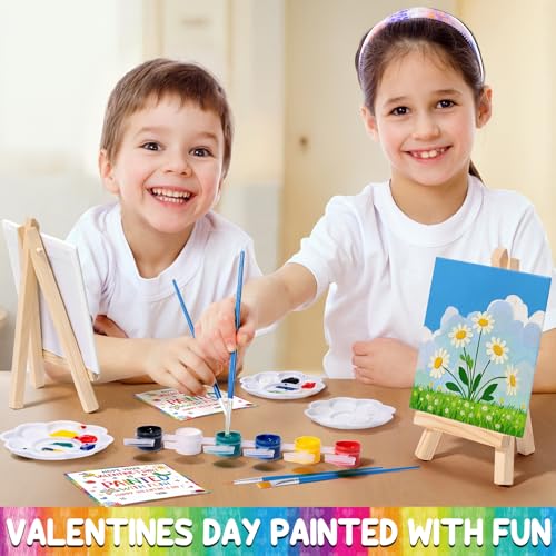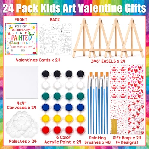Valentines Day Gifts for Kids, 24 Set Mini Canvas Acrylic Painting Kit with Valentines Day Cards, Wood Easel, Canvases, Paint for Kids Girls Boys, Exchange Gifts School Classroom Prizes Party Favors