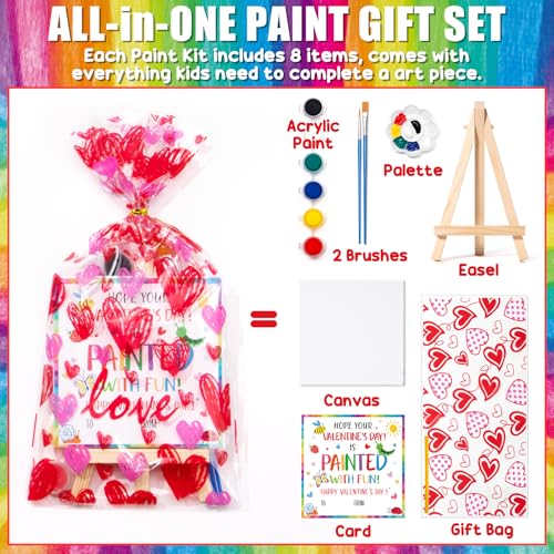 VALENTINES MINI PAINT SET FOR KIDS: This acrylic paint set for girls and boys includes 24 mini canvases, 24 wooden easels, 24 palettes, 48 brushes, 24 valentines cards and 24 gift bags. The gift bags come in 4 heart-covered designs, adding a festive touch to this kids painting set as a valentines day gift. The mini paint kits with kids valentines day cards are ideal valentines exchange gifts for kids, valentines party favors, kids valentines day gifts for school, classroom valentines day gifts